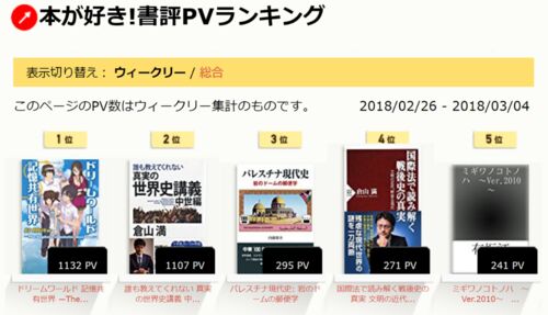 本が好き書評PVランキング本が好き!書評PVランキング 2018/02/26 - 2018/03/04 http://bit.ly/2dDufYe 第2位 誰も教えてくれない 真実の世界史講義 中世編 www.honzuki.jp 第3位 パレスチナ現代史: 岩のドームの郵便学 www.honzuki.jp 第4位 国際法で読み…